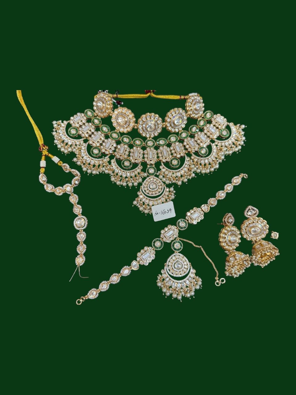 Step into royalty with the Zarira Majestic Kundan Ensemble, a breathtaking jewelry set designed for grand occasions. This luxurious collection features a statement choker necklace, a graceful long chain, an ornate hand harness, an elegant maang tikka, and a pair of dazzling jhumka earrings. Each piece is meticulously crafted with radiant kundan stones, vibrant colored accents, and delicate pearls, reflecting the timeless artistry of traditional Indian jewelry. Available in both regal ruby-red and emerald-green color themes, this set is perfect for brides and celebrants seeking a truly majestic look.